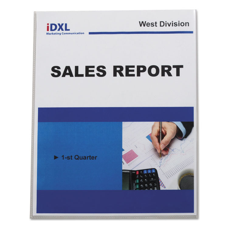 This unique document holder can provide the same level of protection as other heavyweight sheet protectors, but without the pre-punched binding edge. If documents are to be stored loosely instead of in a binder, this storage option has a much cleaner overall appearance. Use them to protect frequently used materials or to post signs and notices. Top-loading polypropylene sheet protectors are made of extra-durable heavyweight polypropylene, and they're manufactured acid-free to prevent photocopy transfer.