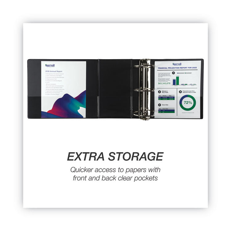 Besides storing documents, a binder is also an ever-present accomplice of office goers, students, and homeowners looking to be more productive and organized. These durable binders feature a clear overlay on the front, back, and spine giving full control and flexibility over customization of presentations, organizational projects, office reports, class projects, and more. Order multiple binders to create a custom reference system for weekly or monthly office reports, multiple classes at school, or other unique personal or professional projects. Binders are also non-stick, which prevents transfer of ink or lifting copy when materials are inserted in the cover or placed inside. This makes it easy to reuse and update the covers and spines as often as you'd like. plastic is tightly sealed over rigid chipboard made from 100% recycled fiber with at least 98% post-consumer content. Rings are mounted on the back lid which allows pages to lay flat and prevent wear and tear of the documents. Such a construction also adds to a sleek, clean appearance with no-rivet spine. Also includes two clear inside horizontal pockets for additional storage and organization of loose documents and non-punched papers. Each pocket provides enough space to hold notes, photos, business cards, or full-size pages that will be punched later. Perfect for school, office or even managing your personal documents at home.