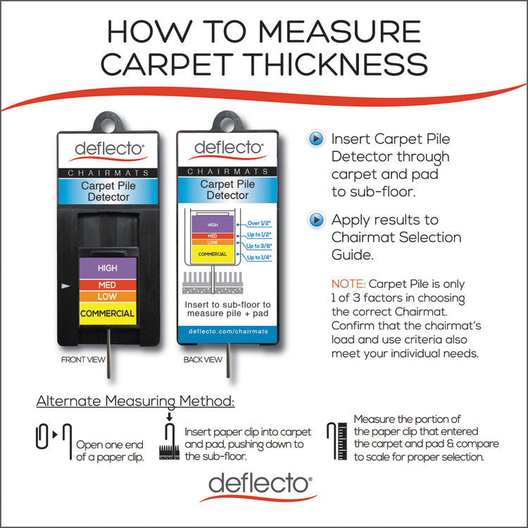 Thinner mat provides a great value while offering economical performance. Lightweight chair mat for occasional use on carpets up to 1/4" thick. Easy-glide rolling surface provides effortless chair movement. Studded design secures mat from moving while protecting carpet from caster wear, spills and heavy traffic. Free and Clear® non-orthophthalate, non-cadmium formula promotes a healthy work environment while offering exceptional clarity and durability. Classic straight edge finish.