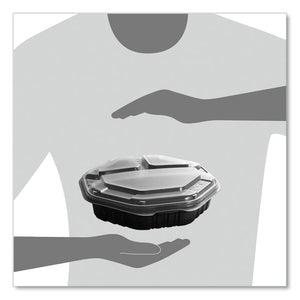 OctaView Hinged-Lid Hot Food Containers, 3 Compartments, 38 oz, 9.55 x 9.1 x 2.4, Black/Clear, Plastic, 100/Carton