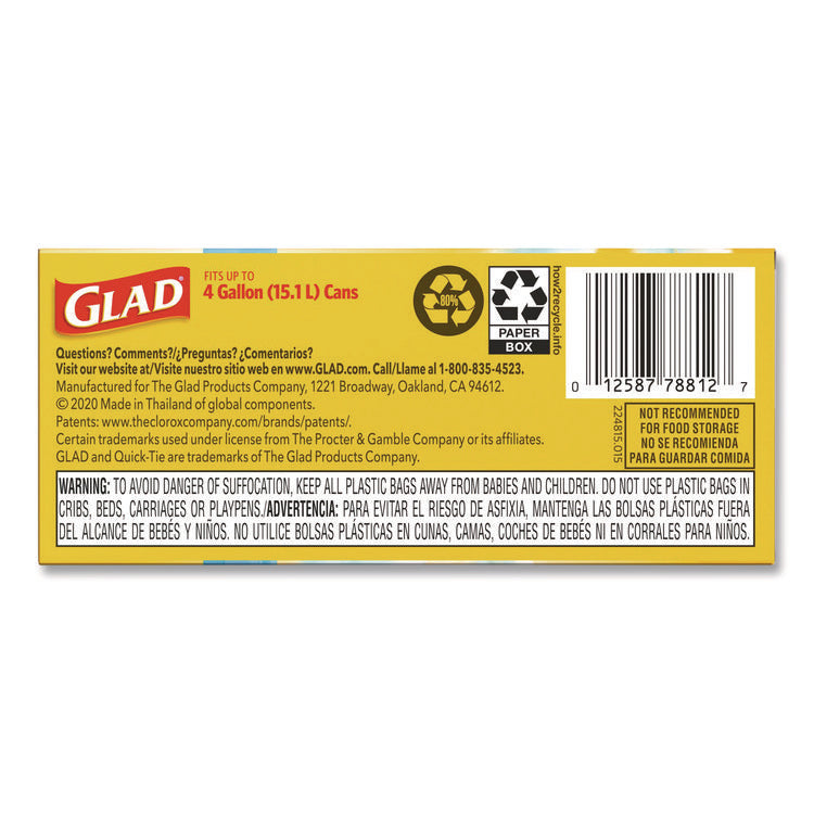 - Handle daily household and everyday demands with Glad's small sized 4-gallon garbage bag.