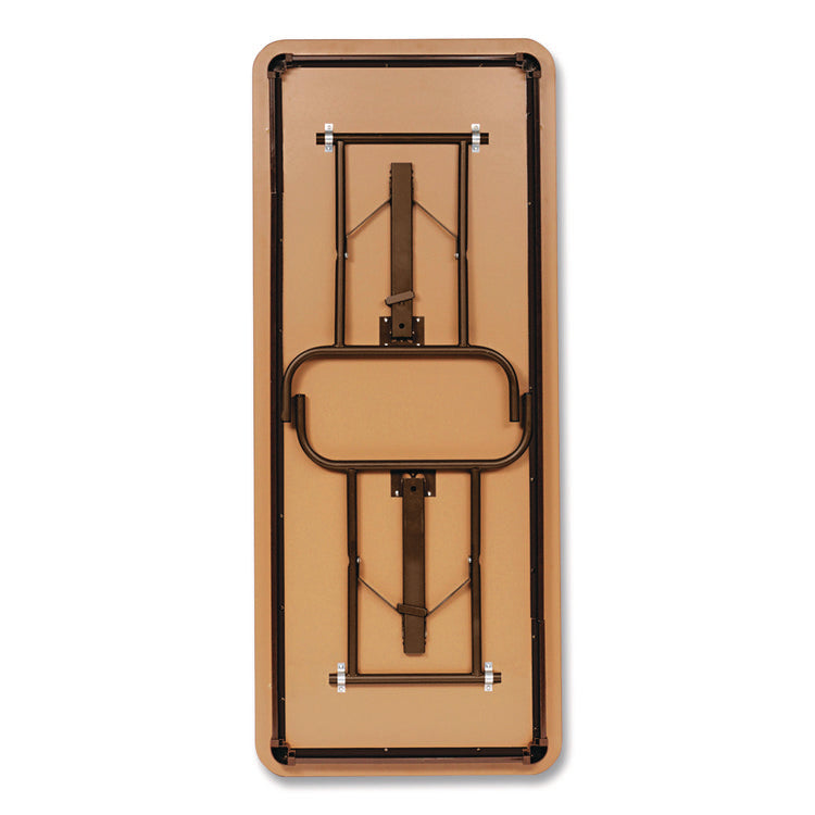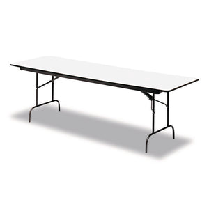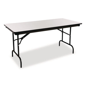 Wear-resistant, 3/4" thick melamine top with vinyl T-mold edge. Melamine sealed underside helps prevent moisture absorption. Full perimeter steel skirt support with plastic corners to protect surface when stacking. 1" diameter, heavy gauge steel legs with heavy-duty foot caps to protect floors. Heavy-duty leg supports and gravity leg lock for secure set-up. Folds to 2-1/2" for compact storage.