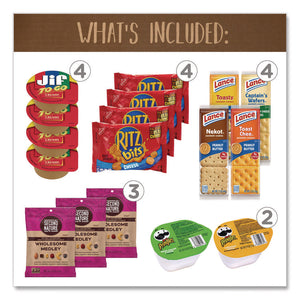 Always running around? This On-The-Go Snack Box is packed with all kinds of snacks that are perfect for grabbing and going! Whether you're out doing errands, spending the day outside, or running from meeting to meeting, this snack box is exactly what you need. On-The-Go Snack Box comes with Second Nature Naked Medley, Planters Variety, Pringles, Kar's Sweet & Salty, Lance Cookie and Cracker, Jif-To-Go, Ritz Bits and Nature Valley bars. Products may vary by flavor per brand and substitutions may be made due to availability.