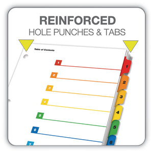 Cardinal® OneStep® Table of Contents Dividers help you create an index system instantly. Matching, preprinted tabs on the divider sheets can be used in either vertical or landscape formats. Tab sets have coordinating Table of Content sheets. Easy to use, free templates in your favorite software are available online; details on packaging. Tabs and ring edges are reinforced to withstand heavy use. Laser and inkjet compatible. Three-hole punched and sized for 8.5" x 11" sheets.