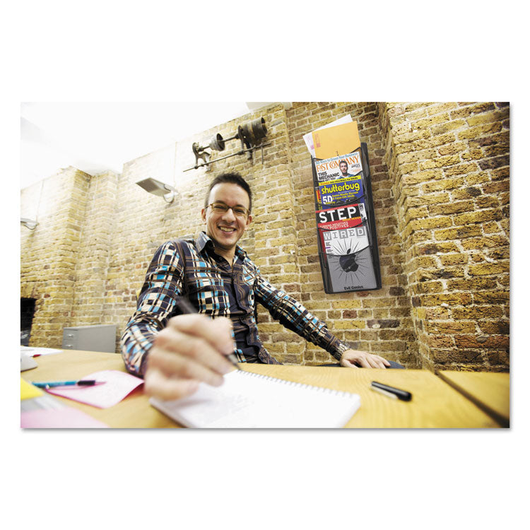 A contemporary look in magazine racks that will fit into any setting. Perfect for use in a front office, reception area or work area for keeping literature close at hand. Wall mounting hardware included. Features black powder coat finish for durability.