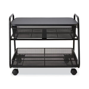 - Steel frame with wood laminate shelf and shelf with mesh baskets for storage of printers, fax machines, files or other supplies.