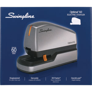 Quiet yet powerful, the Optima® 60 Electric Stapler is the perfect choice for large stapling jobs. Up to three times faster than average, it delivers quick and accurate stapling that's ideal for any office, classroom or home. Low-staple indicator alerts you when you're running low, and QuickLoad™ technology ensures easy staple reloading. Simply eject an empty staple magazine with the press of a button. Adjustable depth guide helps you accurately position staples, while suction cup feet help hold the stapler securely in place. Jam-free performance guaranteed—use with Swingline S.F.® 4® Premium Staples or Optima® High-Capacity Staples for best results. Comes with a starter pack of 500 Optima High-Capacity Staples.