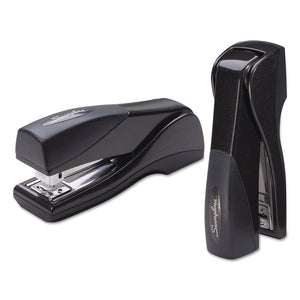 Ergonomically designed specifically for handheld use-the compact size makes it ideal for smaller hands. Delivers 25% greater capacity than other desktop staplers. Jam-free from the first staple to the last with Swingline® S.F.® 3® staples. Streamlined design lets stapler stand vertically or sit horizontally. Sturdy metal construction with soft-feel material for enhanced handheld comfort. 2 1/8" throat depth. Loads a half strip (105) of 1/4" standard staples.