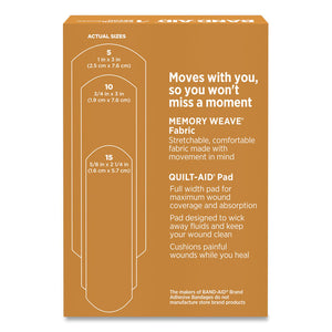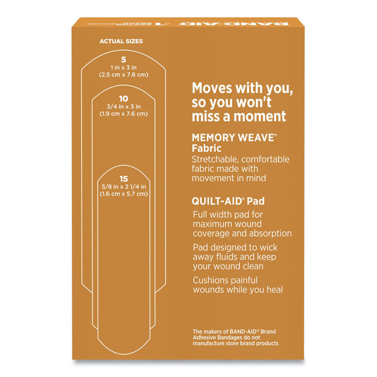 Band-Aid Brand Ourtone Flexible Fabric Adhesive Bandages in assorted sizes provide a wound care option in shades for brown skin tones. Designed to blend in with your skin tone, these fabric bandages are made with memory weave fabric to cover and protect minor wounds, cuts and scrapes by stretching, bending, and flexing with your skin as you move. From the #1 doctor recommended bandage brand, the flexible bandages protect against dirt and germs for up to 24 hours to help with your healing wounds. Each bandage features a Quilt-Aid pad for complete coverage that won't stick to the wound as it wicks away blood and fluids, allowing for gentle removal. Apply the sterile adhesive bandage to clean, dry skin for minor wound care and change daily, when wet, or as needed. Launching a range of bandages in shades for brown skin tones, Band-Aid Brand Ourtone Adhesive Bandages embrace the beauty of diverse skin.