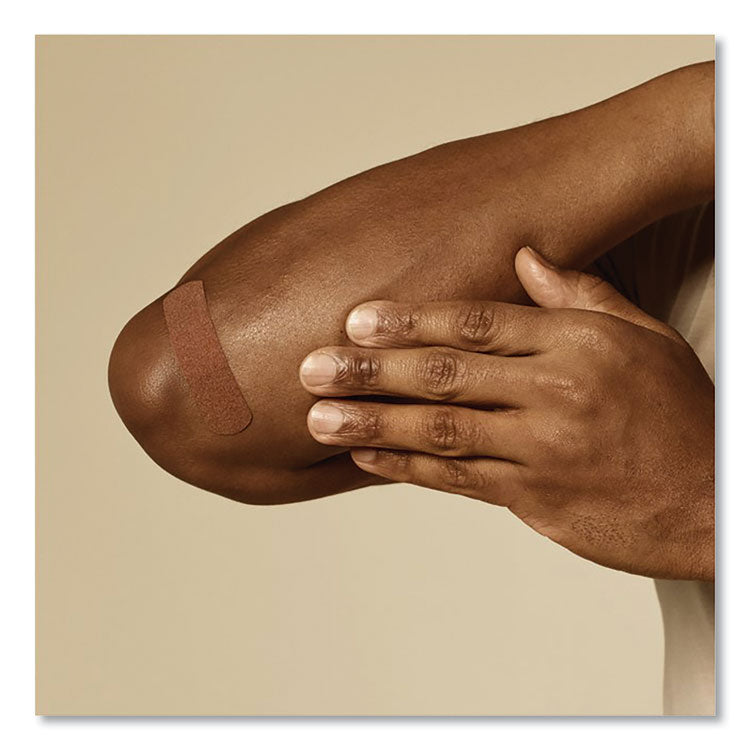 Band-Aid Brand Ourtone Flexible Fabric Adhesive Bandages in assorted sizes provide a wound care option in shades for brown skin tones. Designed to blend in with your skin tone, these fabric bandages are made with memory weave fabric to cover and protect minor wounds, cuts and scrapes by stretching, bending, and flexing with your skin as you move. From the #1 doctor recommended bandage brand, the flexible bandages protect against dirt and germs for up to 24 hours to help with your healing wounds. Each bandage features a Quilt-Aid pad for complete coverage that won't stick to the wound as it wicks away blood and fluids, allowing for gentle removal. Apply the sterile adhesive bandage to clean, dry skin for minor wound care and change daily, when wet, or as needed. Launching a range of bandages in shades for brown skin tones, Band-Aid Brand Ourtone Adhesive Bandages embrace the beauty of diverse skin.