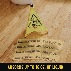 The Rubbermaid Commercial Over the Spill Pad Station is the most effective way to immediately deal with spills, covering the spilled liquid and alerting pedestrians with its bright yellow color. The spill pad is made of strong, melt-blown polypropylene that absorbs up to 16 ounces of fluid per pad. Each spill pad also has the universal caution symbol and the message "Caution Wet Floor" in English and Spanish.