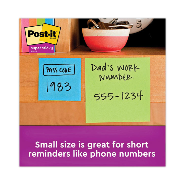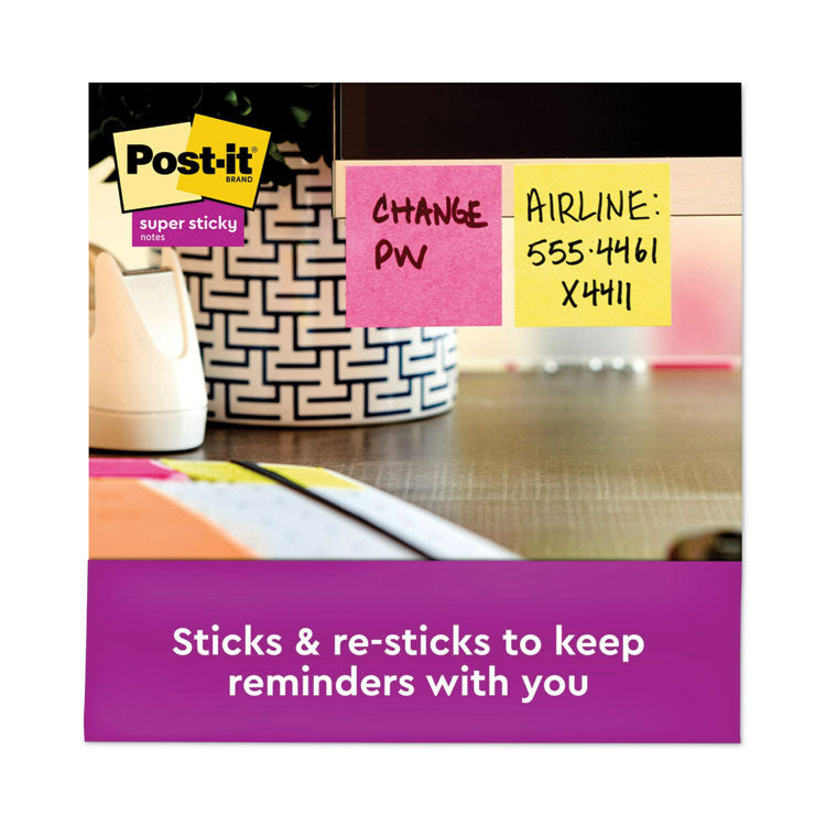 Experience the power of 2X stickiness and get the creative juices flowing with the bright, playfully dynamic colors of the Energy Boost Collection. Super Sticky Notes stick to practically everything, everywhere, and these vibrant, spirited colors can brighten your mood and your messages! Revolutionary technology ensures your notes will stick securely to most surfaces yet remove cleanly. Versatile and essential, they're the perfect solution for lists, reminders, color-coding, labeling, brainstorming, storyboarding and even mural art. As they adhere firmly to walls, windows, doors, worksurfaces, mirrors and more, you can stick and restick them wherever they're most likely to be noticed. To enhance your note-taking experience, download the free Post-it® App to your smartphone or tablet and instantly capture, save and share your important notes.