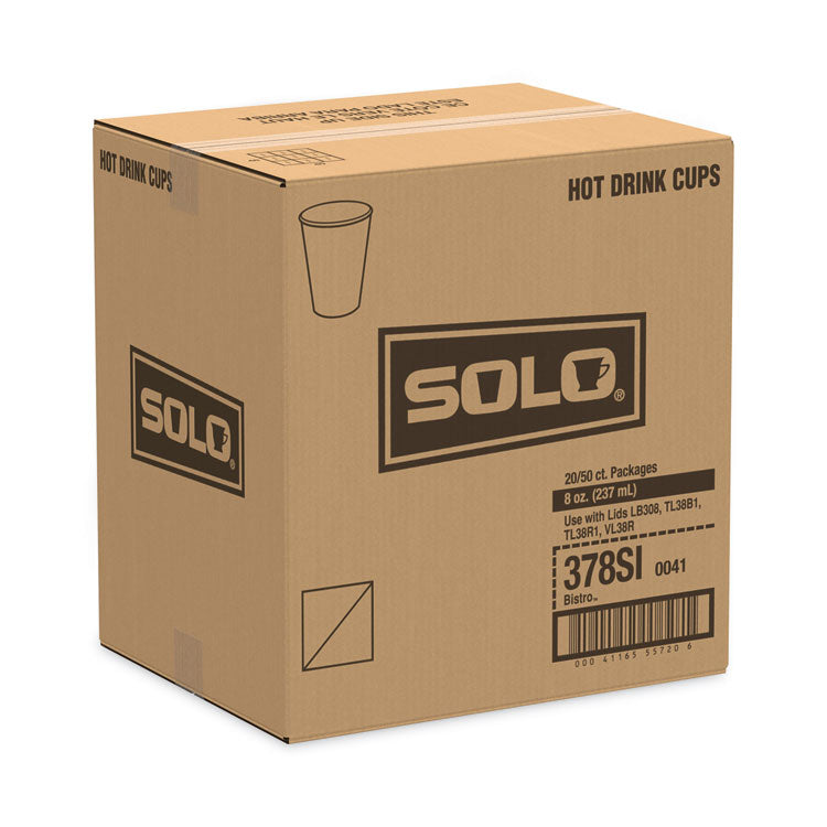 Enjoy hot drinks the hassle-free and sustainable way with these 12 oz paper hot cups. Whether you're serving freshly brewed coffee, herbal teas or creamy hot chocolate, the Bistro® print will enhance your customers' experience. The rolled rim adds extra strength for a comfortable sip every time. Protect against leaks thanks to the moisture-resistant lining, making them a perfect to-go option for coffee shops, restaurants or breakrooms. Combining durability and reliability, these cups are crafted from plant-based renewable resources, showcasing your commitment to sustainability. They pair perfectly with a variety of lid styles for a secure, snap-tight fit. Their stackable design enhances operational efficiency, while the printed sleeves simplify product identification and reordering. Each sleeve features a scannable bar code for precise inventory management. Perfect Pak® cases are designed with a condensed pack size to help operators organize limited storage space. They offer flexibility for small and medium sized businesses. Whether you're managing an office or organizing an event, these Solo® paper hot cups are sure to be a hit with you and your customers. These cups may be recycled if you have access to a recycler that accepts paper cups. Such facilities may not exist in your area. They are made with at least 88% renewable resources. We source fibers certified under the SFI® chain of custody. They are made in the USA with U.S. and global materials.