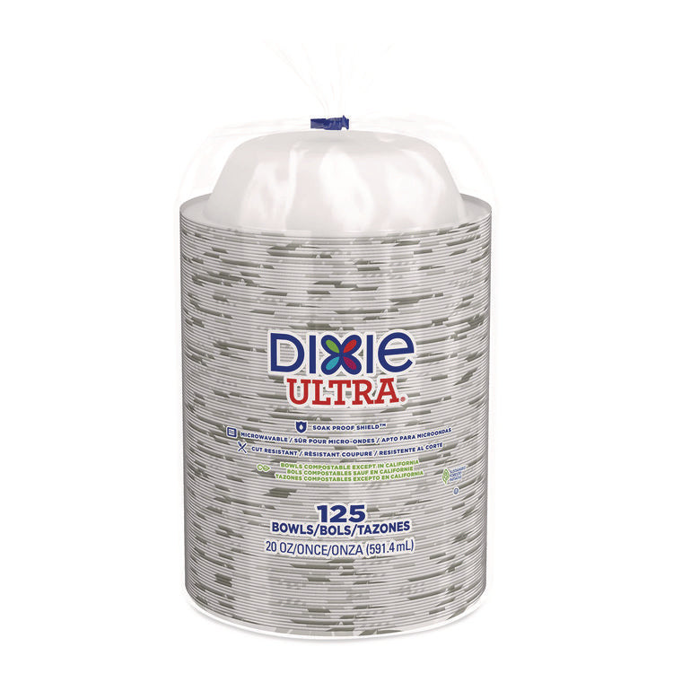 Moisture resistance, grease resistance and dry and wet rigidity make Dixie Ultra® Heavy-Weight Paper Bowls the right choice for the heaviest, messiest foods you serve. The unique structure and multi-layer coatings give these disposable paper bowls their strength, while the Soak-Proof Shield helps keep moisture and grease from leaking through. The Pathways® design matches other Dixie Ultra® plates, platters, bowls and cups to create an attractive, coordinated look. These heavy-duty paper bowls are ideal for foodservice and special events, and because they're microwaveable and cut-resistant, these small paper bowls come in handy in kitchens and breakrooms.