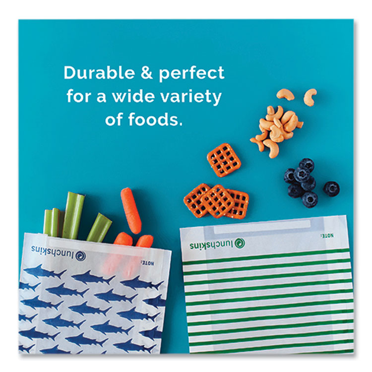 Finally, a disposable sandwich bag you can feel good about using. The box is designed to fit perfectly in your kitchen drawer. Remove self-adhesive closure strip to seal in freshness. The LunchSkins durable and naturally grease-resistant paper bag is recyclable plus sealable. Perfect for sandwiches, snacks, treats, and much more. Use at home or on the go. Winner of the 2017 Green Award.