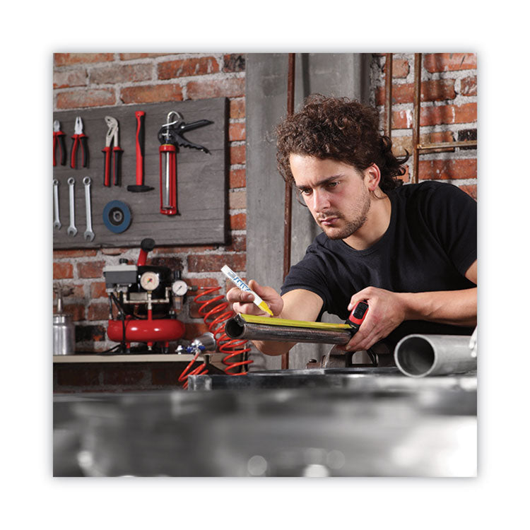 Create permanent and accurate marks on virtually any surface with uni Paint oil-based paint markers from uni-ball. These markers deliver strong and clearly visible lines. Quick-drying paint is water, fade, heat and abrasion resistant. Valve action control provides excellent flow and coverage, while also preventing the marker from drying out if left uncapped. Permanent paint colors mark opaque and glossy on both light and dark surfaces, no matter what it is applied to. The metal barrel and durable tip ensures a long marking life. Ideal for manufacturing, construction sites, automotive, metal fabrication, aviation, marking oily, greasy items and identifying parts or equipment outside.