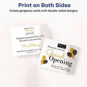 Do you have something to say? Spread the word with these sturdy bright white cards that work in your printer and are formatted to meet U.S. Postal regulations. Eye-catching engagement announcements, business ads, coupons and invitations are yours for the creating. Just use free templates from Avery Design & Print to combine color, graphics and text into a unique design. Then print and apply the required postage and let the postal service do the rest. Your recipients will receive professional-looking postcards worth talking about. Avery do-it-yourself printable postcards are thick and customizable and deliver superior, professional-looking print quality.