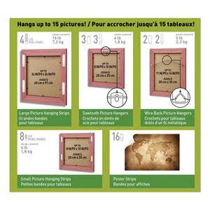 | Special Features | Hangs up to 15 Pictures—Includes 3 sawtooth picture hangers, 2 wire back picture hangers, 5 large strips, 4 pairs of large picture hanging strips, 8 pairs of small picture hanging strips and 16 poster strips. |