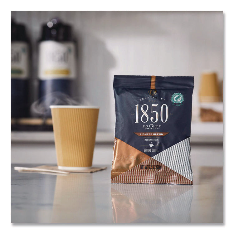 Seek your fortune with 1850 Pioneer Blend medium roast ground coffee. Made with 100 percent Arabica beans, this medium roast coffee is balanced with notes of roasted nut flavor. Pre-measured packs are ground for easy commercial brewing.