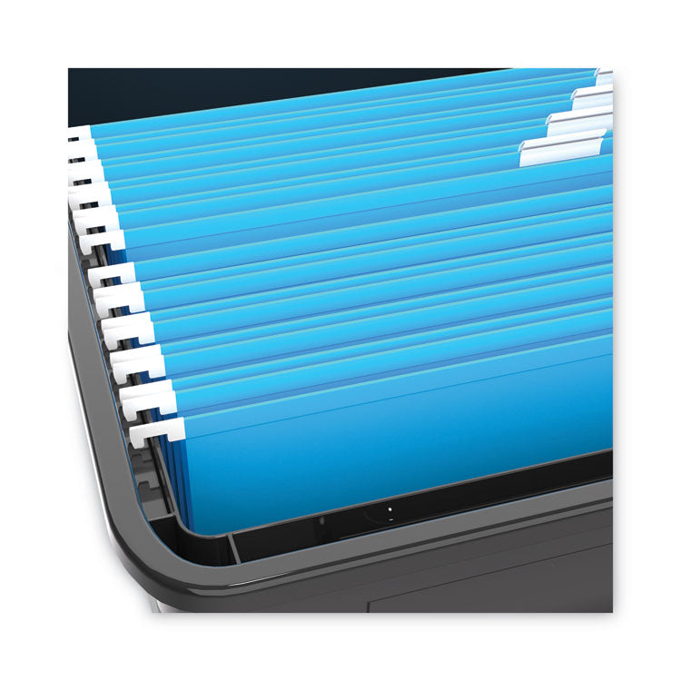 For storage that needs to be quick and simple there's the Storex Storage Tote. Accommodating of hanging folders and water-resistant, the storage tote is a great alternative to cardboard banker boxes. The snap on lid or locking handles ensure that tote contents stay put through tosses and tumbles.