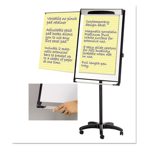 Magnetic Platinum Dry Erase Mobile Presentation easel features a contemporary design with a magnetic porcelain Platinum Pure White™ surface for extensive use. Fully adjustable with five easy-glide casters for full mobility (casters are lockable when not in use). The versatile no-pinch pad retainer with adjustable easel pad hooks allows you to use any size easel pad. It also features two magnetic extension bars that allow you to present up to three sheets of paper at one time and a full length pen tray.