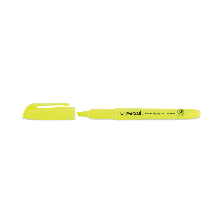 Universal Pocket Highlighters are well-designed highlighting pens that feature bright, vibrant colors. The chisel tip allows for both broad and narrow lines. Long cap with pocket clip holds firmly on either end of the highlighter so it doesn't get lost. The bright ink stands out on the page and dries quickly. Enjoy effortless highlighting with a slender barrel that's comfortable and easy to hold.