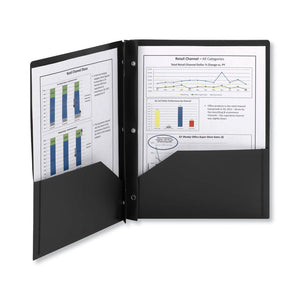 Durable two-pocket folders are perfect for all types of presentations, proposals and projects. They allow for easy storage and transport while keeping the documents organized and easily accessible. The large pockets holds up to 50 sheets each. Metal fasteners hold up to 80 three-hole punched papers. Inside back pocket is die cut to hold a business card. Durable poly material is tear- and water-resistant and easy-to-clean. Acid free and PVC free.