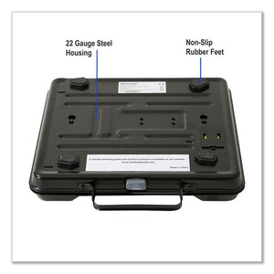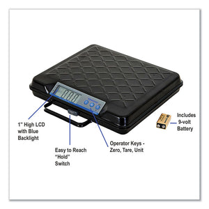 Portable bench scale which is designed for greater accuracy with attached handle. Weight hold key locks weight reading when a larger package blocks the display. Internal backlit display with four 1" high LCD digits for easy visibility. Discreet keyboard technology. Electro-mechanic design. 22-gauge steel base. Auto-zero tracking and manual zero return. 250-lb capacity. Programmable auto-shut-down.