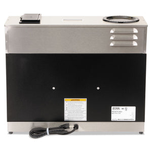 Simple switch-control office brewer that does not require plumbing or special wiring. Just pour cold water in the top and coffee brews immediately. Features three separately controlled warmers. Low profile design fits on most countertops. Stainless steel hood and base with black accents cleans easily with a damp cloth. SplashGard® funnel deflects hot liquids away from hands. Brewing capacity: 3.8 gallons per hour. Server(s) sold separately.