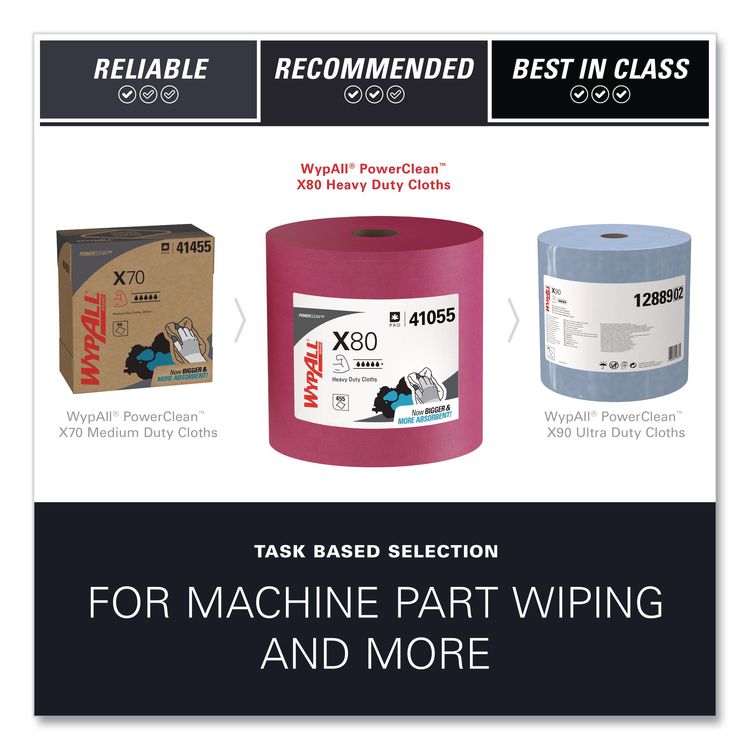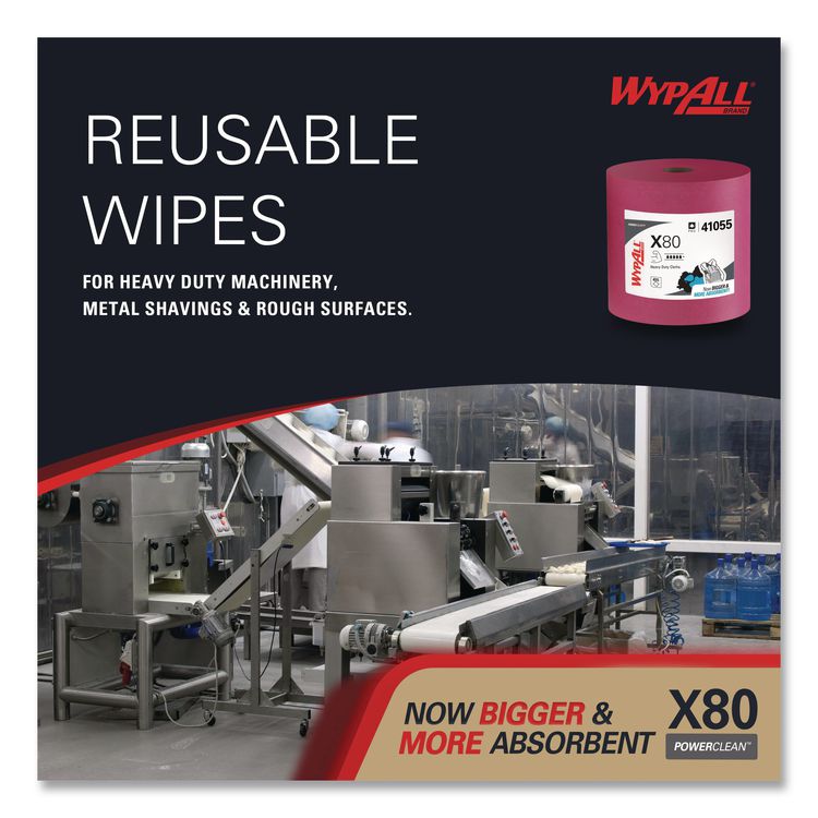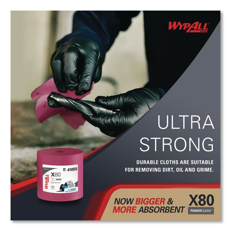 WypAll® is the number one brand of disposable wipes in the US and Canada. Maximize performance while minimizing time, effort and product waste. If you've been using industrial cloth towels, it's time to make the switch to WypAll® PowerClean™ X80 Cloths. These cloths feature innovations like high-tech Hydroknit® fast-absorbing material and are durable for scrubbing. WypAll® X80 cloths now absorb over 20% more oil and up to 15% more water than before. In addition, they now feature a tough, precision-engineered surface texture, making them even more effective for your cleaning tasks. The heavy-duty cloths are made of soft pulp fibers, bonded to a polypropylene base sheet for absorbency and durability, making them suitable for removing dirt, oil, grime and solvents in industrial and manufacturing businesses. The cloths are reusable and reinforced for strength when wet and dry. These bulk cloths are a great alternative – safer and more efficient – to replace laundered rental shop towels and cleaning towels. These premium industrial cleaning cloths can be used for heavy-duty machine and part wiping, wiping metal shavings, prepping surfaces with solvents, and cleaning rough surfaces. When you're running a business, it pays to use the very best supplies. For the toughest grease and grime, trust the performance and innovation of WypAll® PowerClean™ X80 Heavy Duty Cloths.