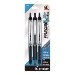 Precise V7RT Rollerball Pen, Retractable, Fine 0.7 mm, Black Ink, Black Barrel, 3/Pack