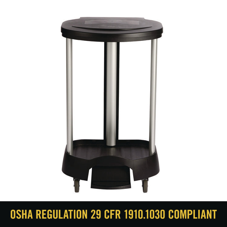 The Rubbermaid Commercial Products Premium Step-On Linen Hamper is ideal for areas where medical waste originates, including patient rooms, lab procedure rooms, and emergency rooms. This linen hamper is a rectangular polypropylene and aluminum hamper with a lid damper and foot pedal that is suitable for use with the 30-gallon Rubbermaid Commercial Premium 6350 linen hamper bag (sold separately) and that complies with Occupational Safety and Health Administration (OSHA) Standard 1910.1030 on blood-borne pathogens for the safe containment of infectious waste. The damper-controlled lid helps contain odors and bacteria and closes gently, making it suitable for hospital rooms and other quiet places. A foot pedal quietly lifts the lid and enables hands-free trash disposal. Polypropylene is more rigid than polyethylene and is resistant to certain chemicals. Aluminum weighs less than steel and resists corrosion and tarnishing. 2 swivel caster wheels on the back and 2 fixed and lockable caster wheels on the front provide quiet maneuverability for noise-sensitive environments. Metal retainer straps hold the linen hamper bag (sold separately) securely in place.
