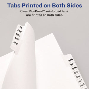 Use these dividers to organize index briefs, legal exhibits, mortgage documentation files and more. The crisp and clean white paper stock dividers give files a professional appearance. The durable Rip Proof™ reinforced tabs are preprinted on both sides so information can be located easily. The unpunched binding edges mean these indexes can fit practically any binding system.