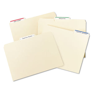 Make file folders stand out with a professional look. These file folder labels feature a strip of eye-catching color at the top to make it even easier to find just the folder you're looking for and are great for color coding. Write on the labels by hand or use the free templates available from Avery® Design & Print to format them easily on your computer and print them with your laser or inkjet printer. The permanent adhesive ensures that your label will stay put without curling away. For a truly standout design, it's hard to beat these convenient labels.