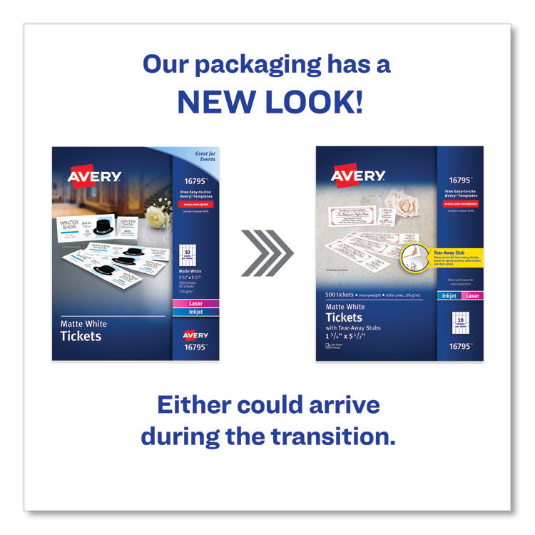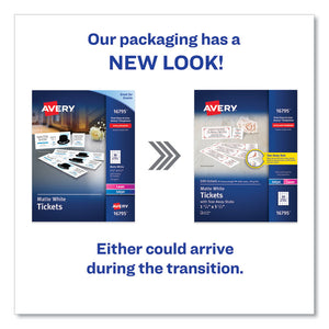 Create a buzz for your event or fundraiser by designing professional looking tickets from your own computer. These customizable Tickets with Tear-Away Stubs are easy to print and offer a professional look, making them perfect for raffles, door prizes, dances, school and church events or fundraisers. You can personalize your tickets on one or both sides at Avery® Design & Print with complimentary designs and templates, which include automatic ticket numbering options for easy record keeping. The tickets separate cleanly after printing with no scissors required. Strong perforations on the stubs ensure they will stay put until your event. Now you can create personalized tickets that will be the talk of any event. For laser and inkjet printers. Ten tickets per sheet. Card size is 1.75" x 5.5".