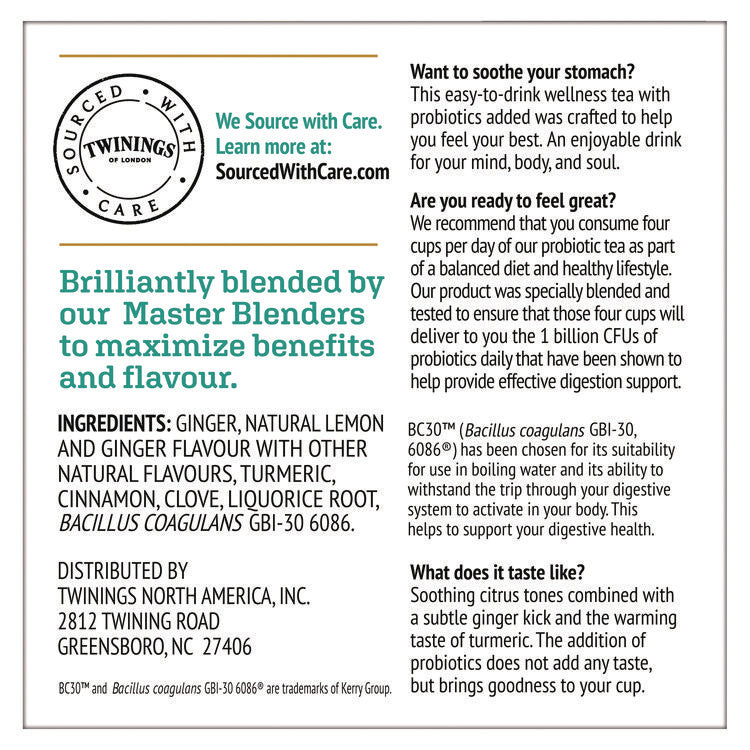 Soothe your stomach as you sip this Twinings Probiotics+ herbal tea which combines a zesty lemon flavor and warming ginger and includes a probiotic for extra digestive support. The soothing citrus tones in this herbal tea are combined with a subtle ginger kick and the warming taste of turmeric. This blend supports your digestive health with the addition of probiotics, which do not add any taste, but bring goodness to your cup.