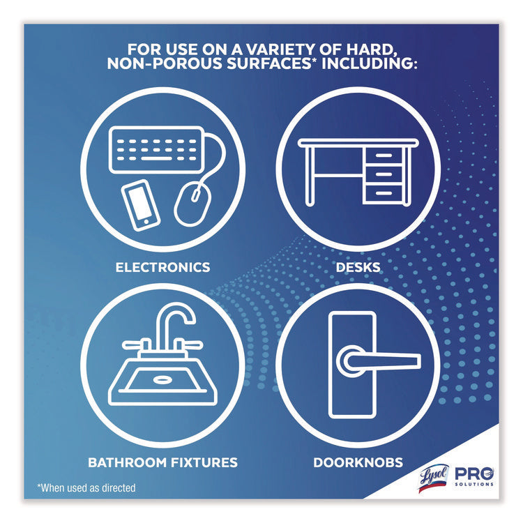 Optimize cleaning with high-capacity Lysol® Professional Disinfecting Wipes that help you meet high-volume needs and reduce restock times for cleaning supplies. Pre-moistened disinfecting wipes kill 99.9% of viruses and bacteria, including the virus that causes COVID-19 when used as directed on hard, non-porous surfaces. Hospital-type disinfection works on a variety of surfaces, including electronics. Quickly clean and disinfect high-touch germ hot spots to help protect your customers and staff. Clean up and keep moving with packaging that's easy to open, dispense, and store.