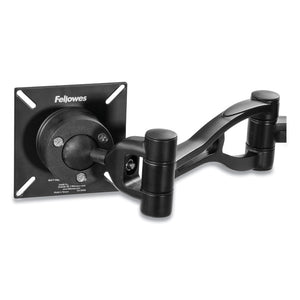 Features two monitor arms that adjust easily in every way. Easy to mount--clamp attaches to desktops 1" to 3" thick or through grommet holes at least 3 1/4” in diameter. Elevates LCD monitors from 3 1/2" to 16 1/2" above the desk with a reach of 2 1/2"-27". Tilts up or down +/- 37 degrees and freely swings left or right (360° rotation capability). Each arm holds an LCD monitor up to 24 lbs. Meets VESA mounting standards.