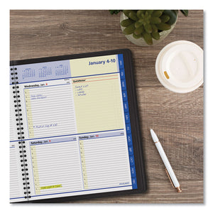 Yellow highlighted section for notes and to-do's. Premium paper resists ink bleed. Includes storage pocket. Weekly: one week per two-page spread with QuickNotes® area. Monthly: step-tabbed full month with ruled blocks on left page, QuickNotes® area on right page; two past and six future months reference. Federal holidays highlighted.