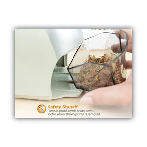 Faster, more powerful sharpening without all the noise-perfect for the office or home. Chic electric pencil sharpener features HHC hardened steel cutters for 65% faster sharpening and a 6x longer life than single-blade models. With quiet ease, the heavy-duty QuietSharp motor operates stall-free with normal use as the thermal-overload protection extends motor life. Tip Saver Technology prevents over-sharpening for pencil longevity. Internal safety switch prevents operation when the easy-clean shavings tray is removed.