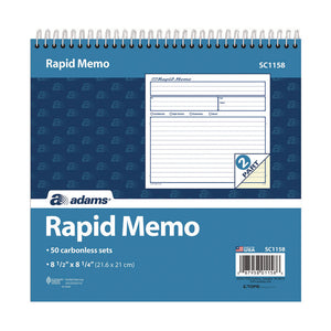 Draft and distribute memos quickly and efficiently. The Adams® Rapid Memo Pad features vertical-orientation forms with a ruled block at top for special notes, a formatted block in the middle for date/subject/recipient details and a ruled block at bottom for the body of the memo. Located between the middle and bottom blocks, a row of handy priority and confidentiality bubbles help you communicate how each memo should be managed. Carbonless, multi-part format allows you to pass along priority memos and keep a copy for yourself. Spiralbound at top.