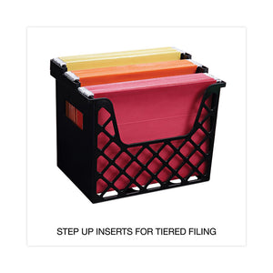 Conveniently store, view, and retrieve files from your desk, tabletop, or floor. Keep a neater workspace by removing the clutter and storing files upright. The convenient step-up inserts allow you to stack in tiers, making it easier to locate the file you need and put it back in its place. Constructed of sturdy, black plastic. Built-in handles are ideal for storage and transport.