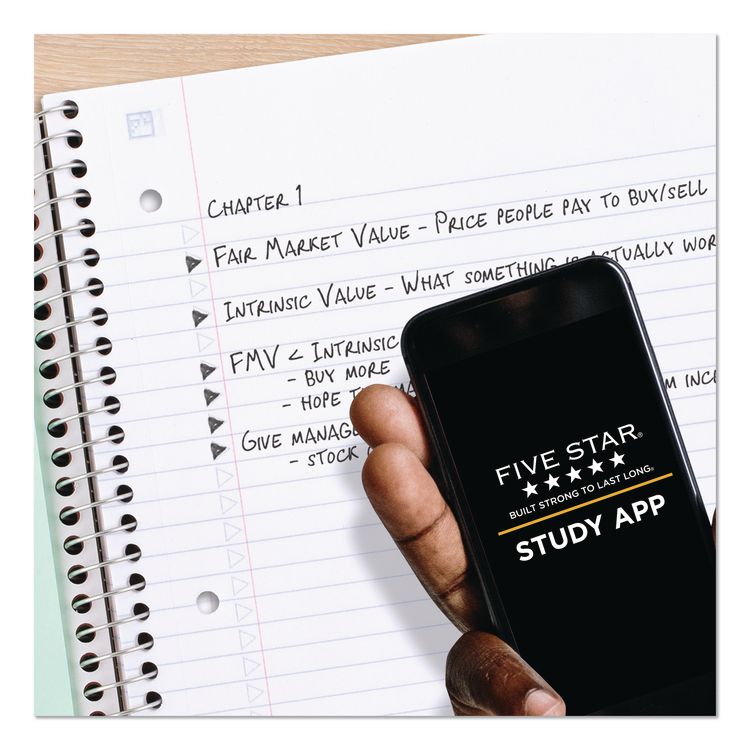 Choose the Five Star Recycled Notebook this year, it gives you plenty of space to organize and jot down notes all year long. Lasts all year—guaranteed! Scan, study and organize your notes with the Five Star App. Create instant flashcards and sync your notes to Google Drive to access them anywhere from any device. Tough two-pocket divider resists tearing. Neat Sheet perforated pages make it easy to tear out assignments. Spiral Lock wire binding prevents coil snags on your clothes or in your backpack. Notebook is recyclable—just remove the reinforcement tape on the pocket and recycle the rest!
