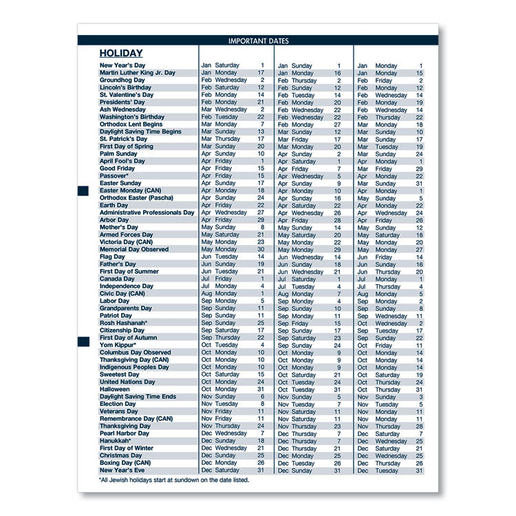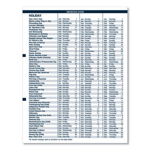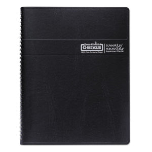 Monthly section features month tabs for easy reference and note space to help keep you organized. Weekly section features a full seven-day week per two-page spread and is ruled for hourly appointments with a full Saturday and Sunday. Includes a double-sided storage pocket. The planner core is bound strongly with wire-binding, and its cover features a strong, black, embossed, simulated-leather finish to withstand daily use throughout the year. Numbered weeks. Includes a three-year holiday list and a three-year reference calendar. Made entirely of recycled materials.