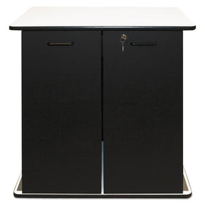 The perfect breakroom addition, holds different types of small objects, cups, utensils. Made of built to last plastic. Spacious top can support microwave or coffee maker. Surface is constructed to resist stains and scratches. Internal shelves can accommodate large-sized supplies. Doors open with ease for frequently used items.