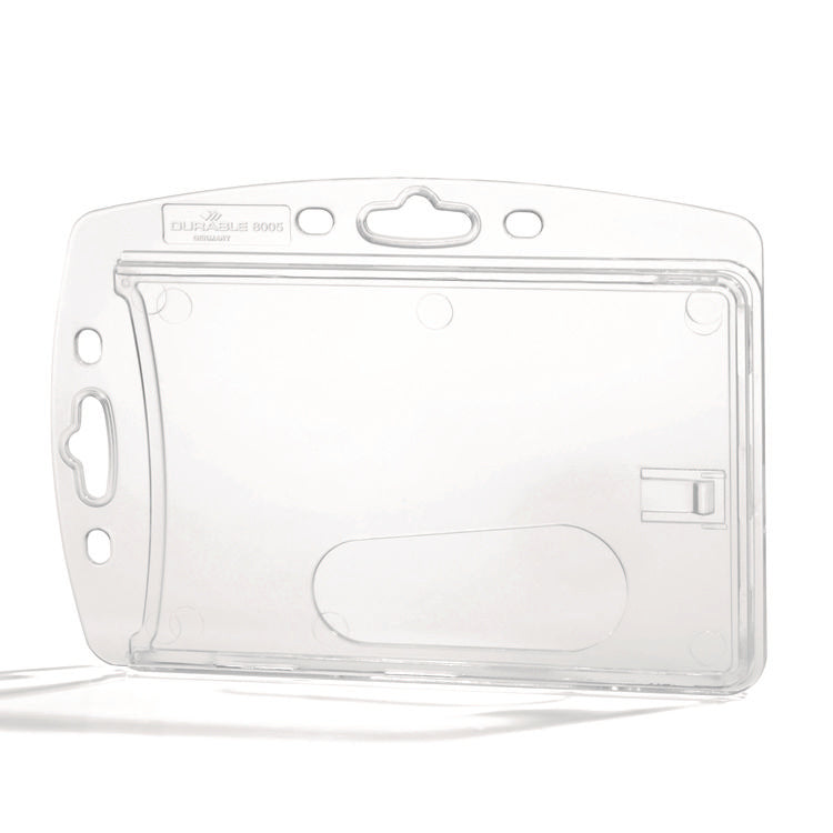 The single-card replacement card holders from DURABLE® are designed to keep one ID card secure and visible. The high-quality material is resistant to wear and tear, ensuring that your badge holder remains in excellent condition even with frequent use. Designed to withstand extreme weather conditions, the badge holder is UV-resistant, cold-crack-resistant down to -4° F, and features a watertight zip-locked enclosure to guard against water damage. This durability is essential for environments where ID cards are exposed to various climates. Whether in construction, manufacturing, or other demanding fields, this card holder stands as a trustworthy companion, prioritizing both functionality and user convenience. For over 100 years, DURABLE has been synonymous with quality, design, and functionality. As an international workplace expert with German roots, we create reliable products built to last. Our commitment to sustainability is embodied by our RETHINK mindset, integrating the four R's (Refuse, Reduce, Reuse, Recycle) into every aspect of our process. Continuing this legacy, DURABLE aims to lead with purpose and responsibility, crafting solutions with lasting value.