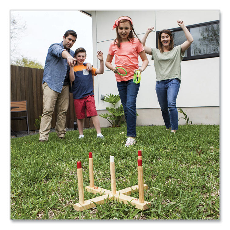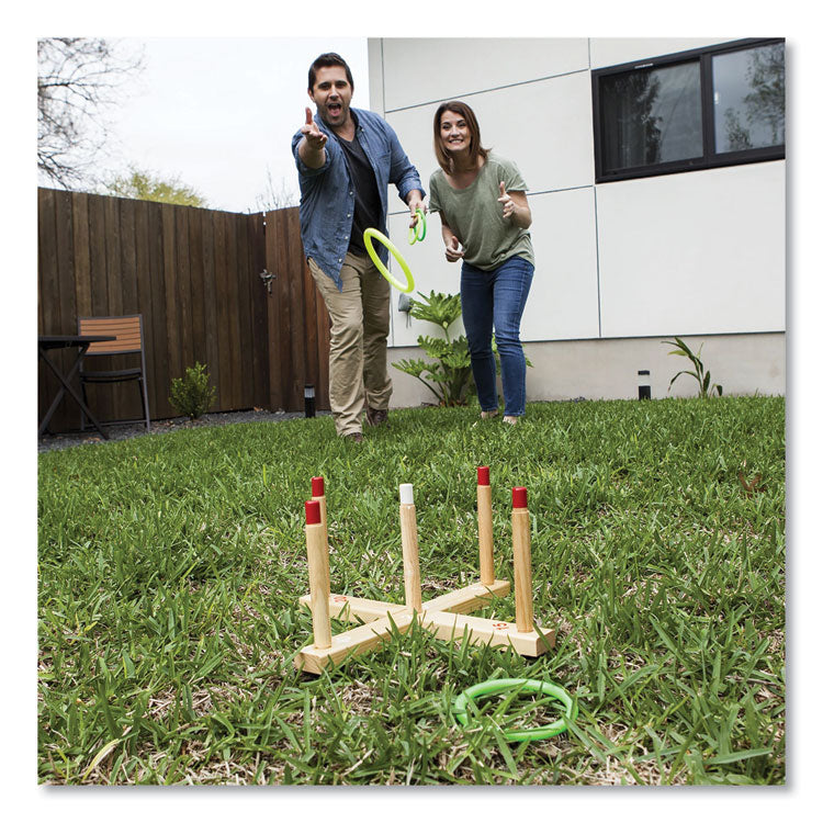 Designed for all-ages fun, the solid wood Champion Sports Ring Toss Set will bring some friendly competition to your backyard, camping trip or tailgate party. The classic game of ring toss helps youngsters improve their hand-eye coordination, precision, and accuracy in a simple two-player game. Score keeping is easy using the labeled base, and non-abrasive plastic rings mean you can play the game inside when the weather turns.