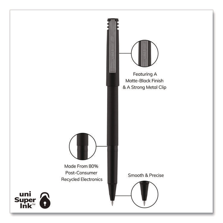 Stock your office, home or classroom with Roller Rollerball Stick Pens from uni-ball featuring strong, long lasting tips. These rollerball pens deliver the silky-smooth glide of a fountain pen without smudging for effortless writing. Roller pens produce neat and precise lines for intricate writing, making it easy to create super fine details in your drawings and diagrams. Capped roller pens are useful for a variety of tasks from note taking to signing checks and legal documents to uniquely embellishing fun and creative writing projects. Innovative uni Super Ink technology forms a strong bond with the paper, protecting from water, fading and fraud. Made from recycled material.