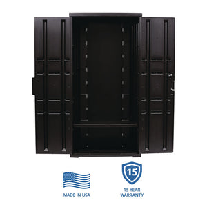 Durable, double-walled construction is resistant to dents, scratches, stains, chemicals and corrosion. Locking doors keep your storage space secure. Ergonomic handles are recessed for easy use. Made with tough, high-density blow-molded polyethylene. Easy assembly with minimal tools.
