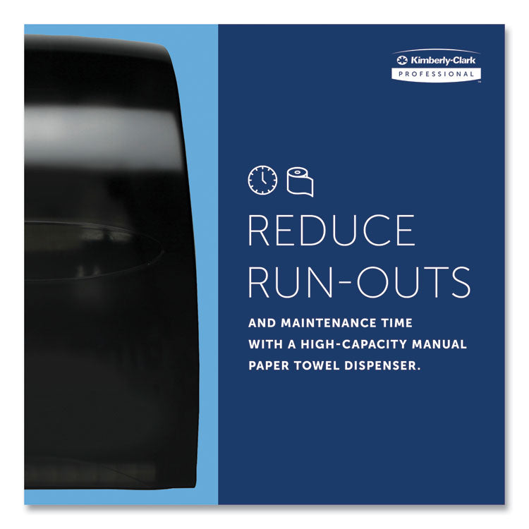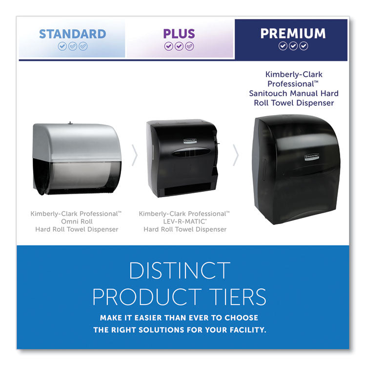 Reduce maintenance time and run-outs with a high-capacity washroom towel system. The Sanitouch Hard Roll Paper Towel Dispenser is a reliable and efficient hand-drying system that's perfect for your workplace. Whether you have a retail location, office or high-traffic location, your washroom guests will only touch the towel they use, thanks to the touch free, one-at-a-time dispensing system. This wall mount dispenser is made of durable plastic and comes in an attractive shade of black, called Smoke, so it will go with any washroom decor. Compatible with Kleenex® and Scott® Brand Hard Roll towels, by providing high-quality towels in your washroom, you'll increase your maintenance efficiency.
